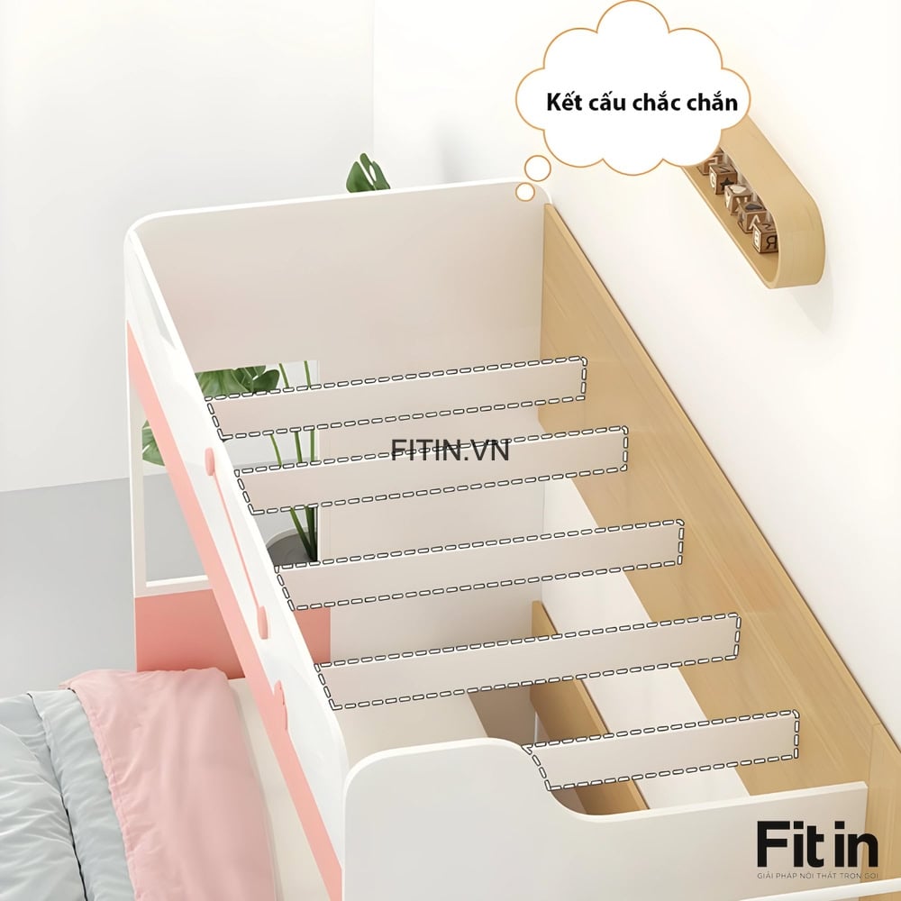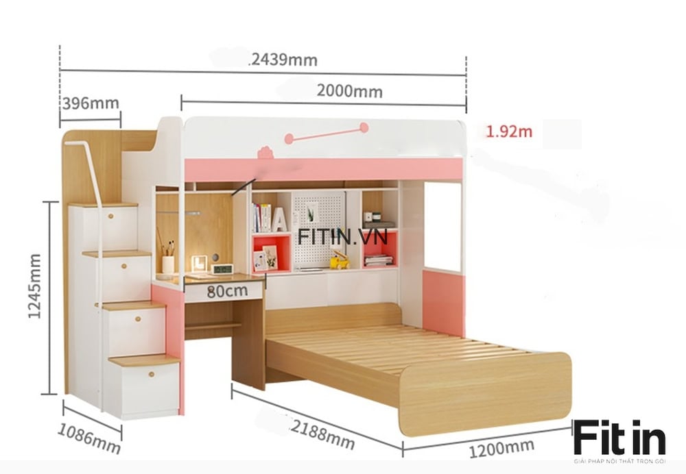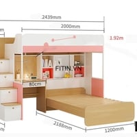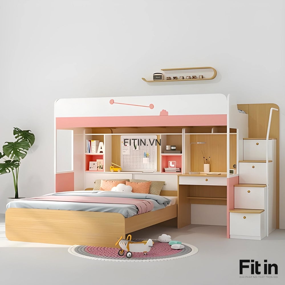 Giường 2 Tầng Cho Bé Gái Liền Bàn Học Màu Hồng Phối Trắng