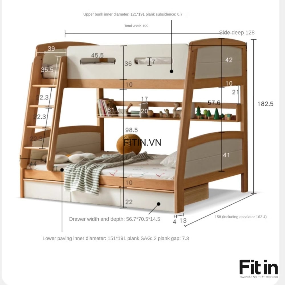 - Tầng trên: 120 x 190cm, 140 x 190cm (rộng x dài)