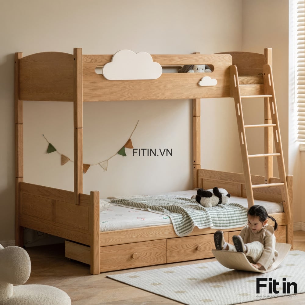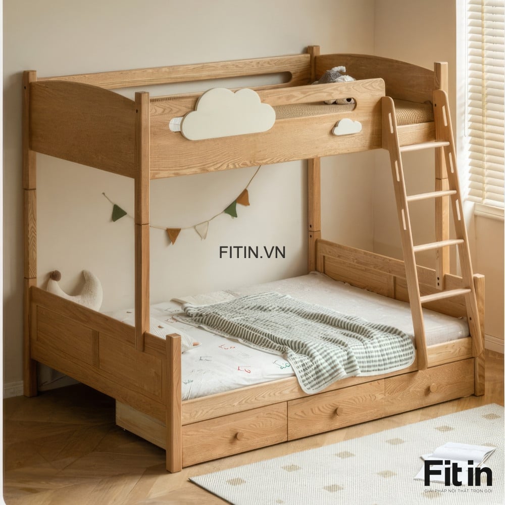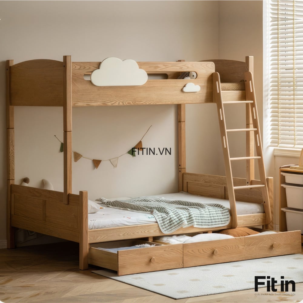 Giường Tầng Trẻ Em Gỗ Sồi Màu Tự Nhiên Chất Lượng Hiện Đại