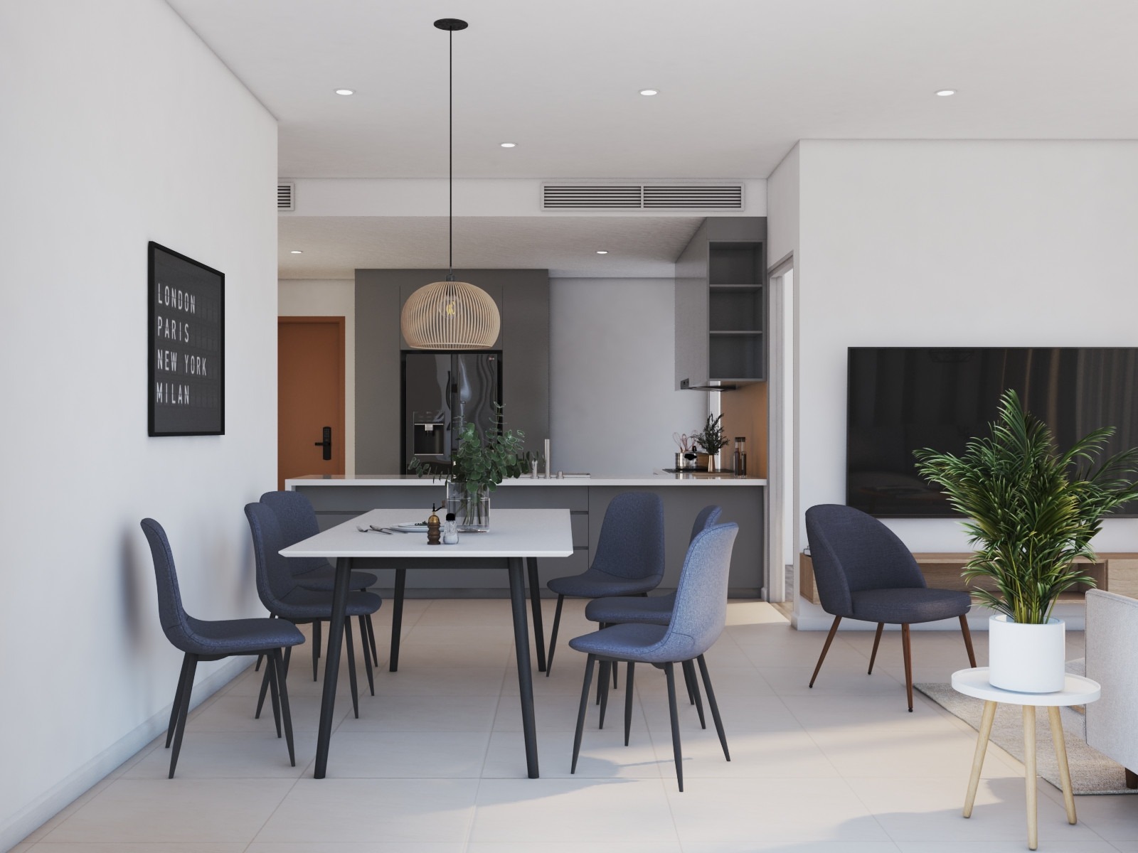 Trong nhà bếp, các vật liệu sử dụng đều mang tính thiết thực cao nhưng vẫn đảm bảo thẩm mỹ: thép không gỉ (chậu rửa bát), PU hay còn được gọi là polyurethane trắng (cửa chạn bát), gỗ sồi (tủ đựng đồ). Khu vực bàn ăn được trang trí với hai chiếc ghế tựa Kennedy kèm phần đệm ngồi màu vàng và Gubi Bettle nhung nổi bật.