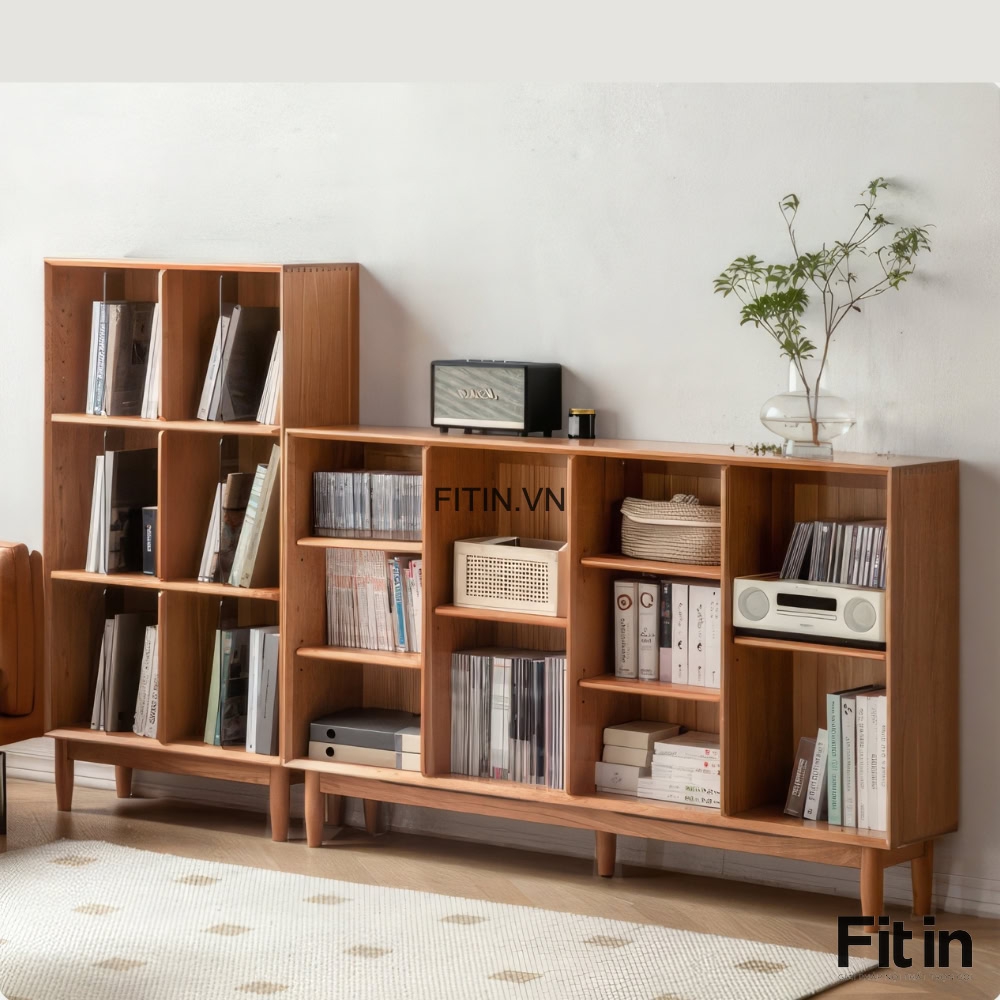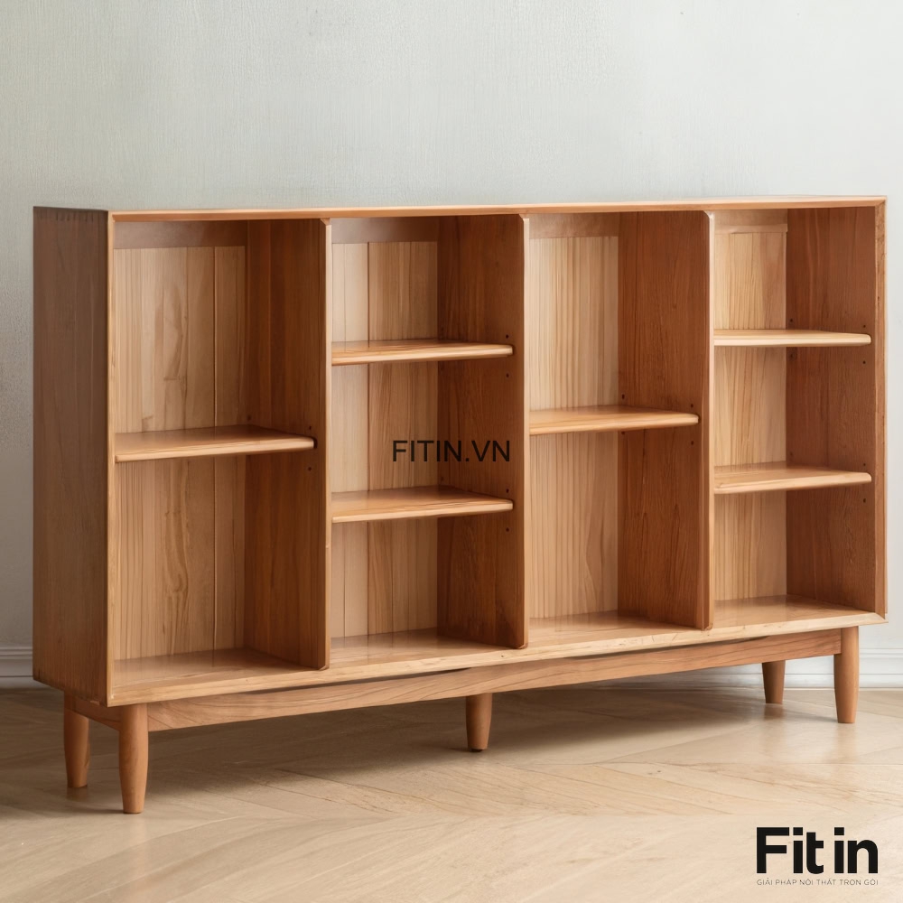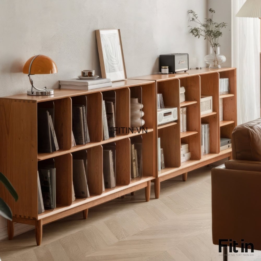 Kệ Sách Đẹp Phòng Khách Dáng Thấp Kiểu Chân Cao Gỗ Sồi