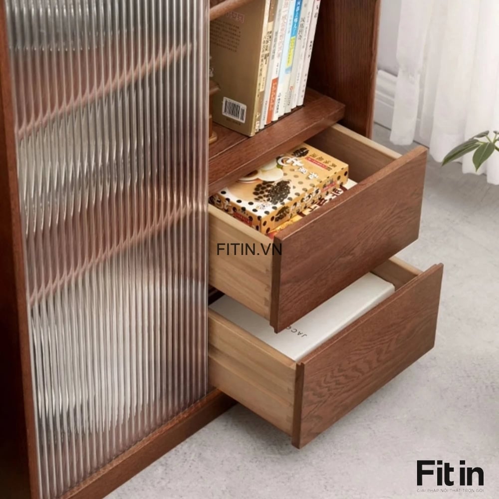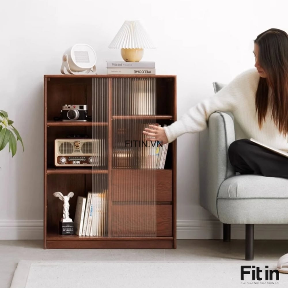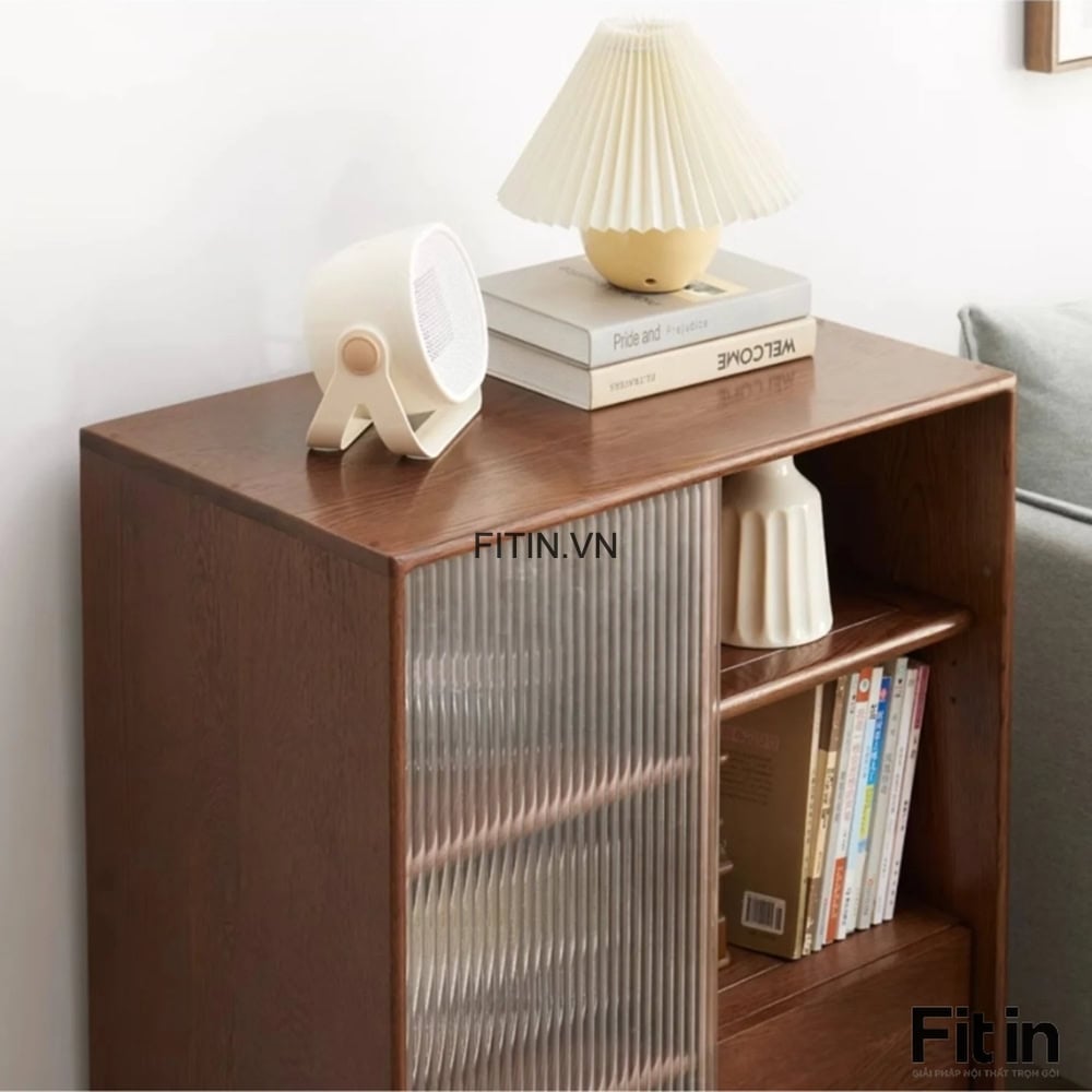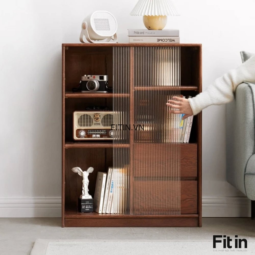 Kệ Sách Hiện Đại Gỗ Sồi Cánh Kính Sọc Kiểu Lùa Chắc Chắn