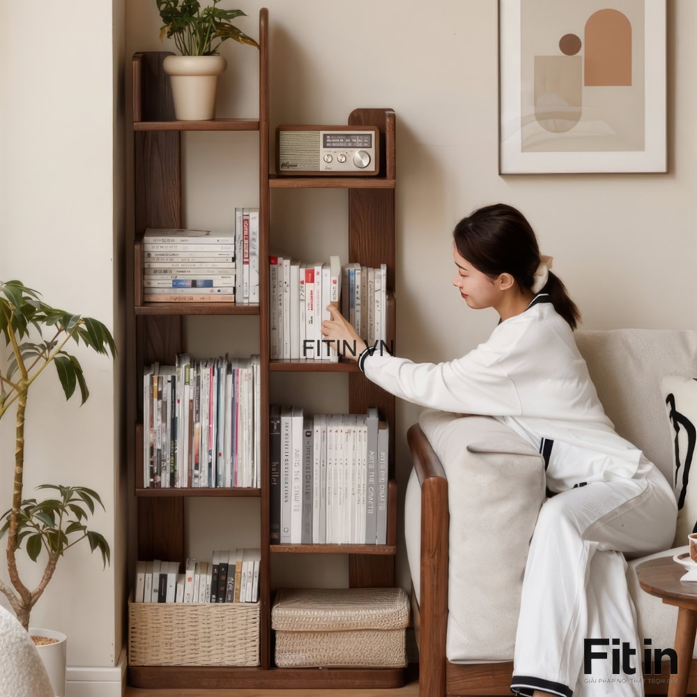 Góc phòng là vùng khó sử dụng trong hầu hết các căn hộ, quá nhỏ để đặt tủ lớn, quá lãng phí nếu bỏ trống. Các kệ, tủ sách góc được thiết kế đặc biệt để lấp đầy khoảng trống chính xác này, tạo ra điểm lưu trữ và trang trí mà không chiếm dụng nhiều diện tích sử dụng của phòng.