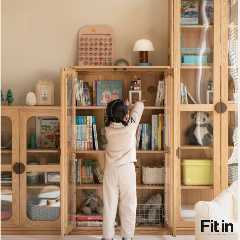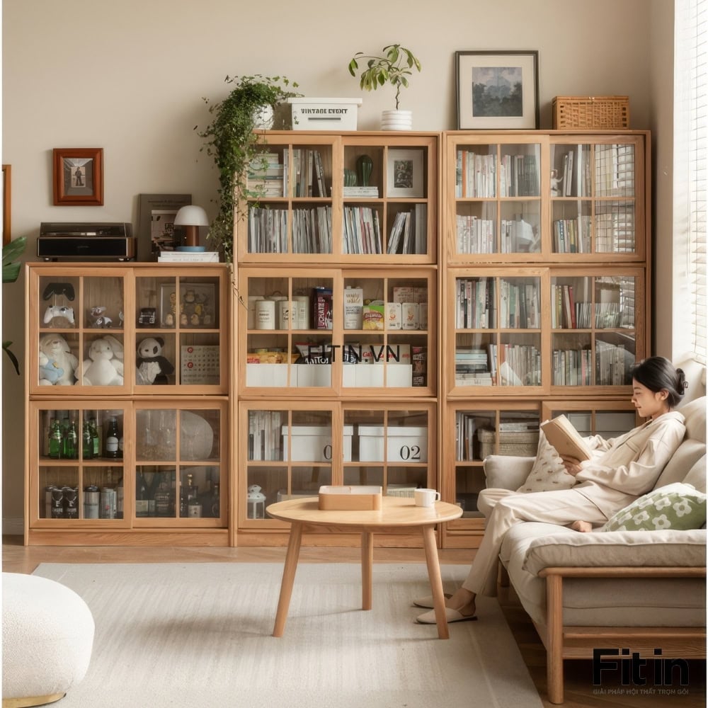 Tủ Sách Gỗ Sồi Tự Nhiên Cửa Kính Trong Phong Cách Bắc Âu