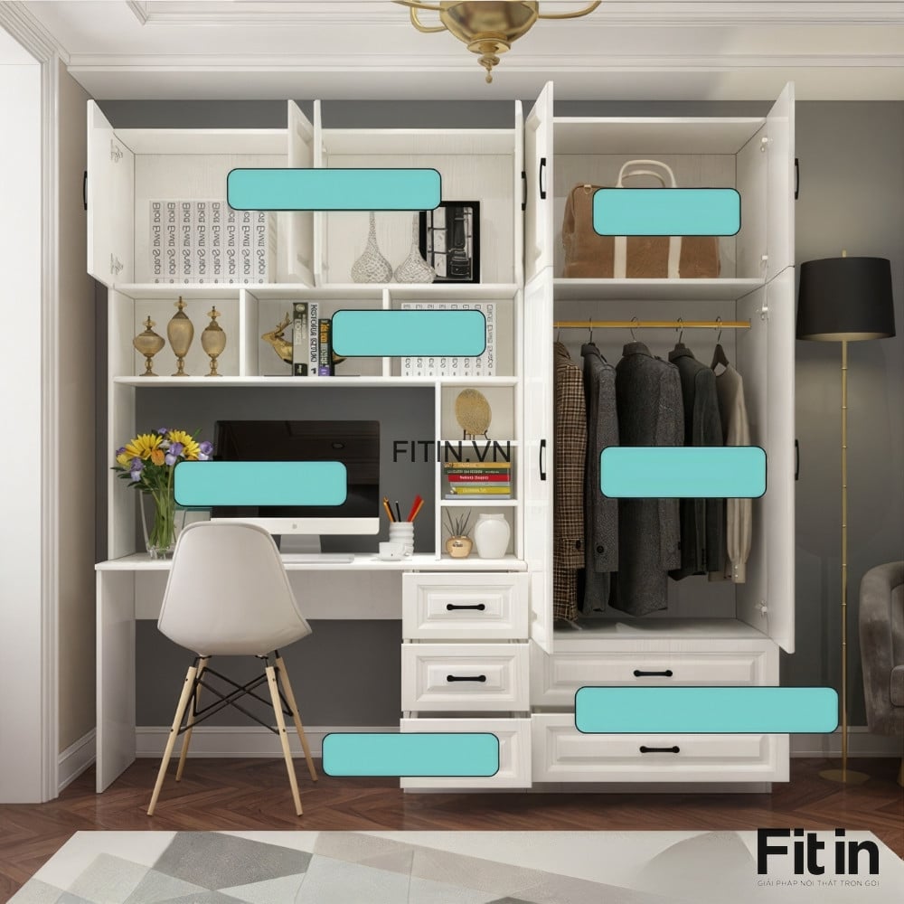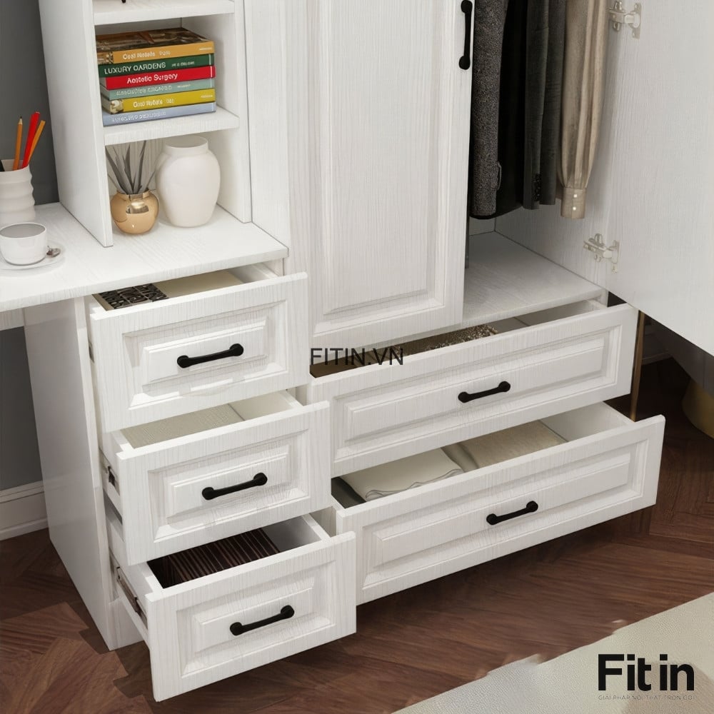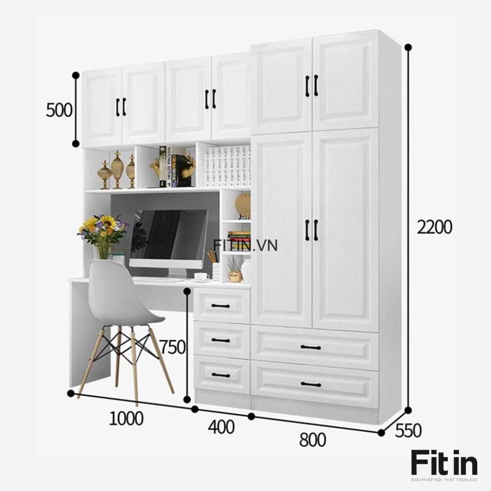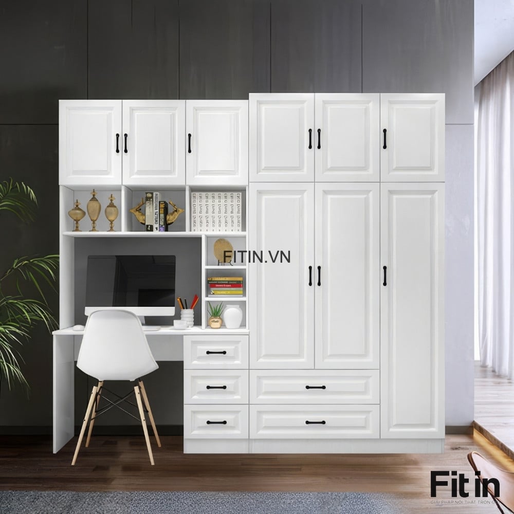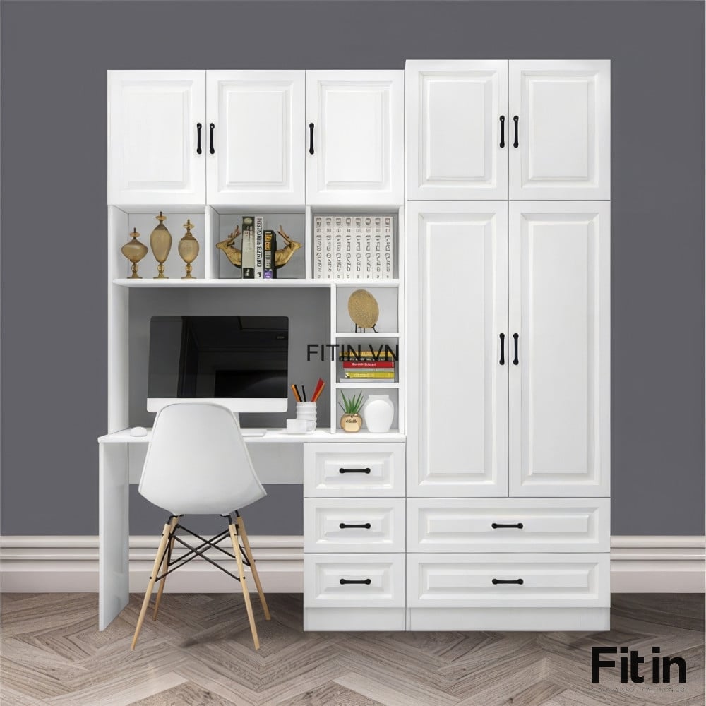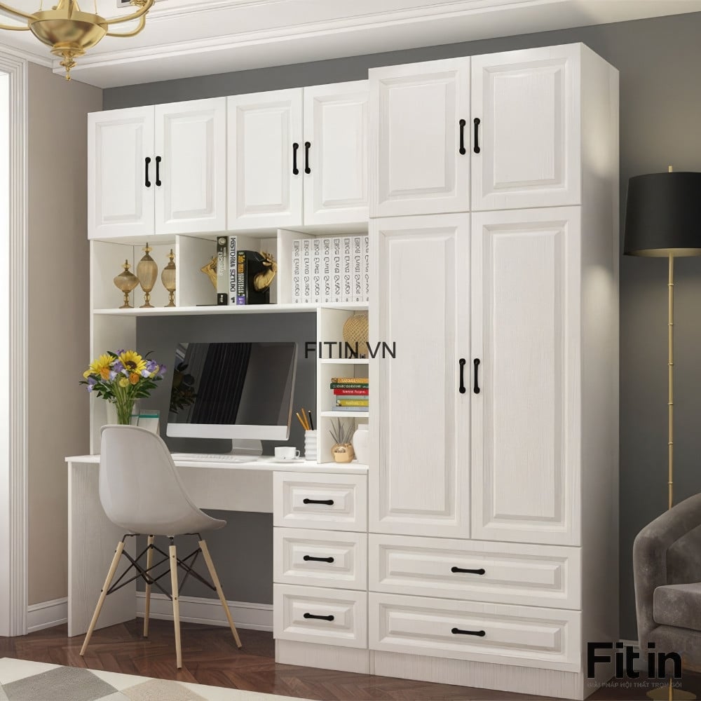Mẫu Tủ Quần Áo Liền Bàn Làm Việc Gỗ MDF Cánh Sơn Trắng Đẹp