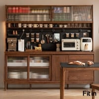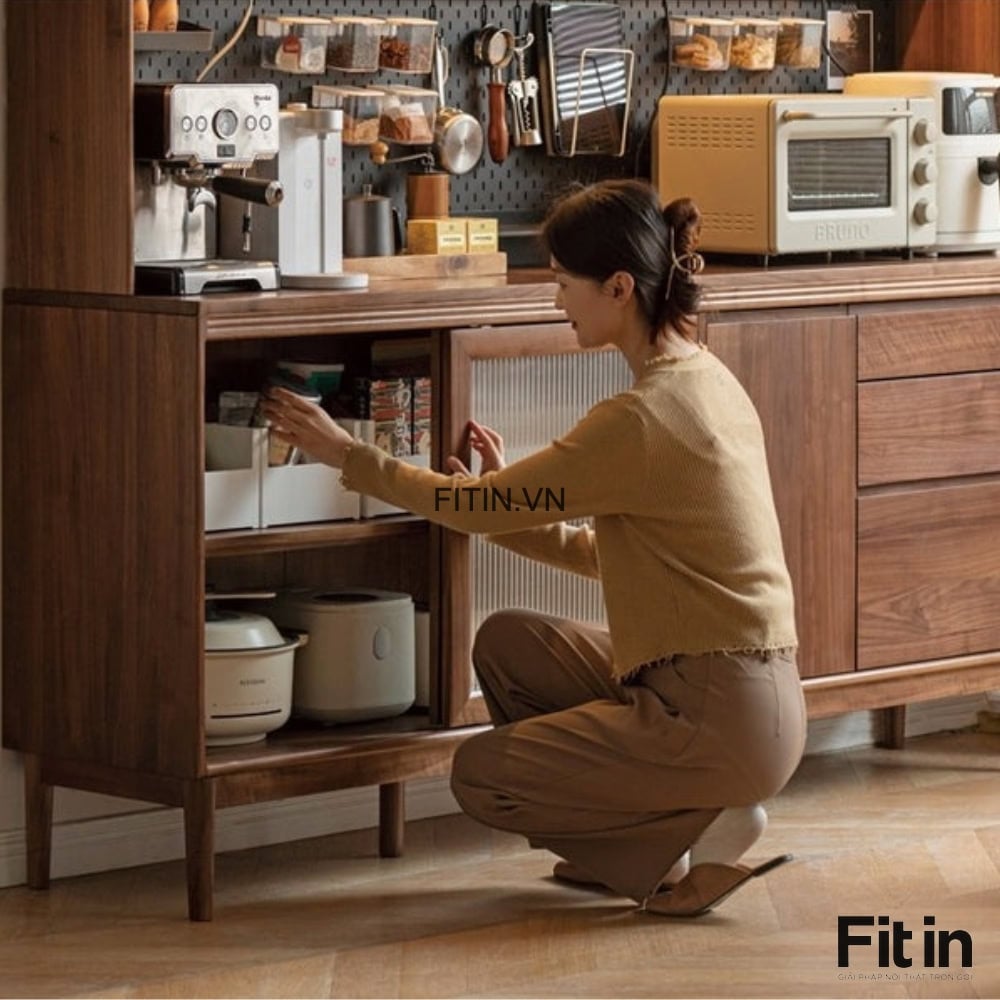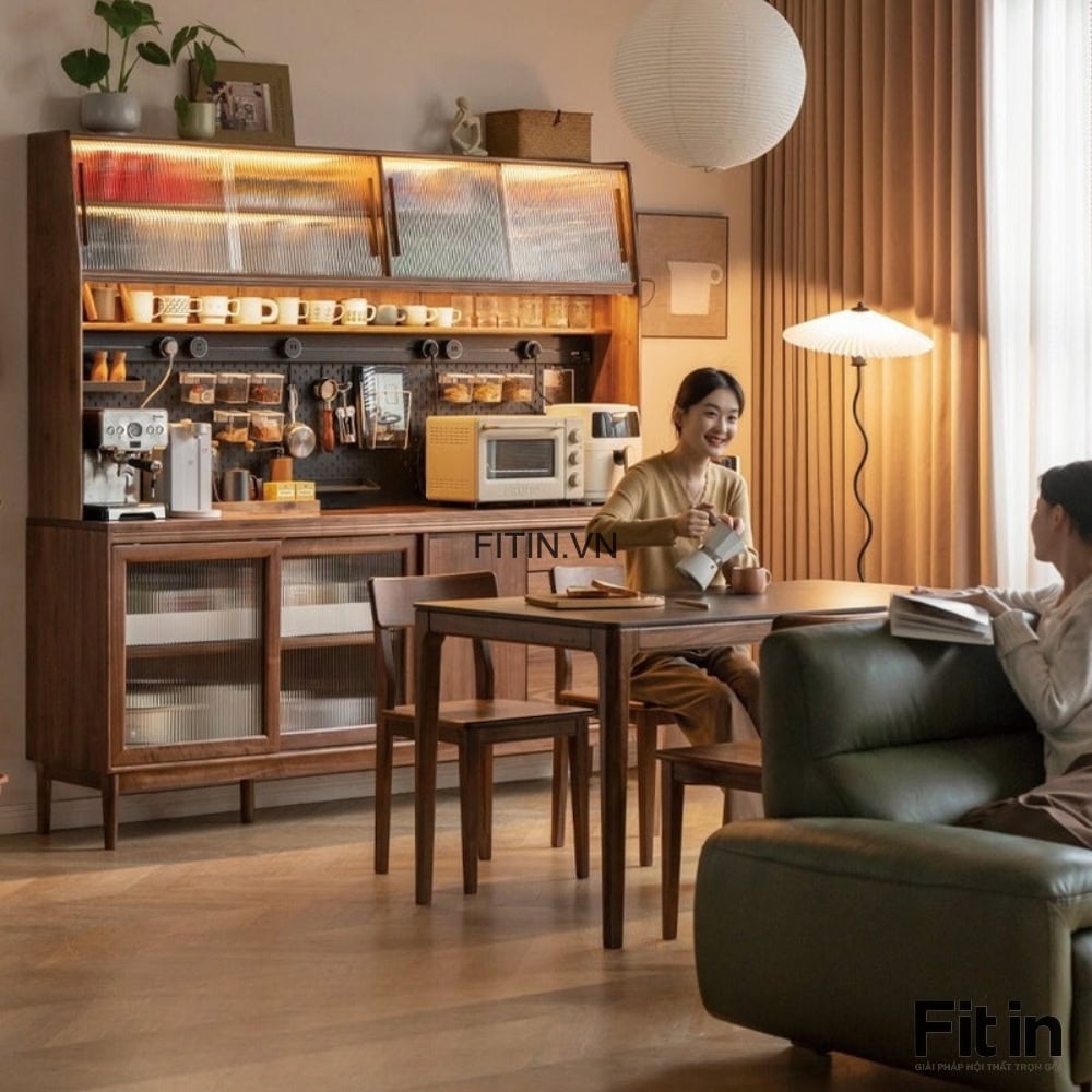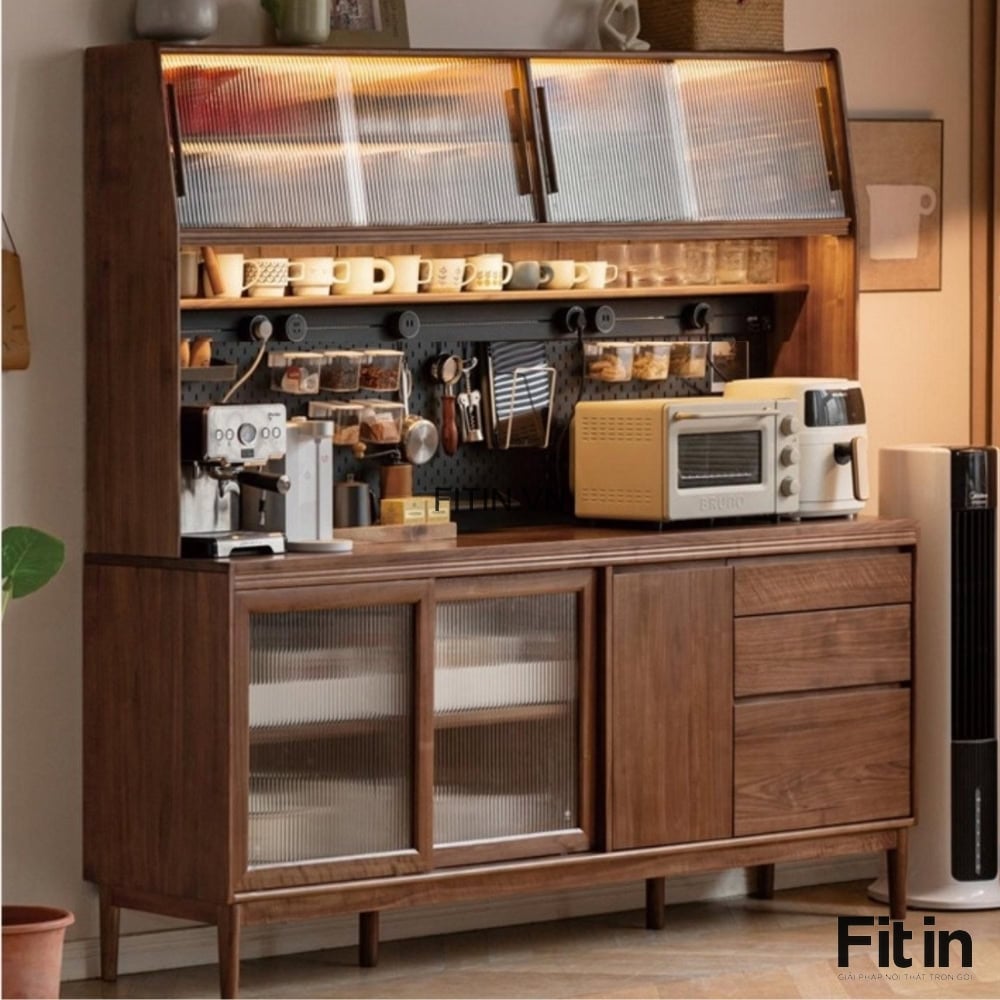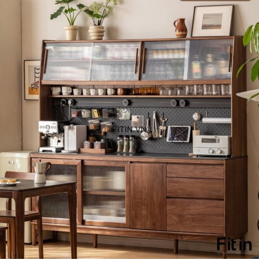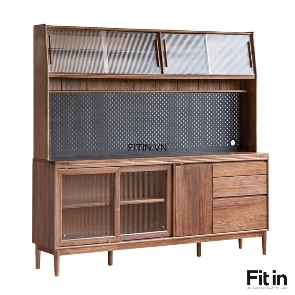 Tủ Chén Lớn Gỗ Tự Nhiên Phủ Veneer Sơn Màu Óc Chó Hiện Đại