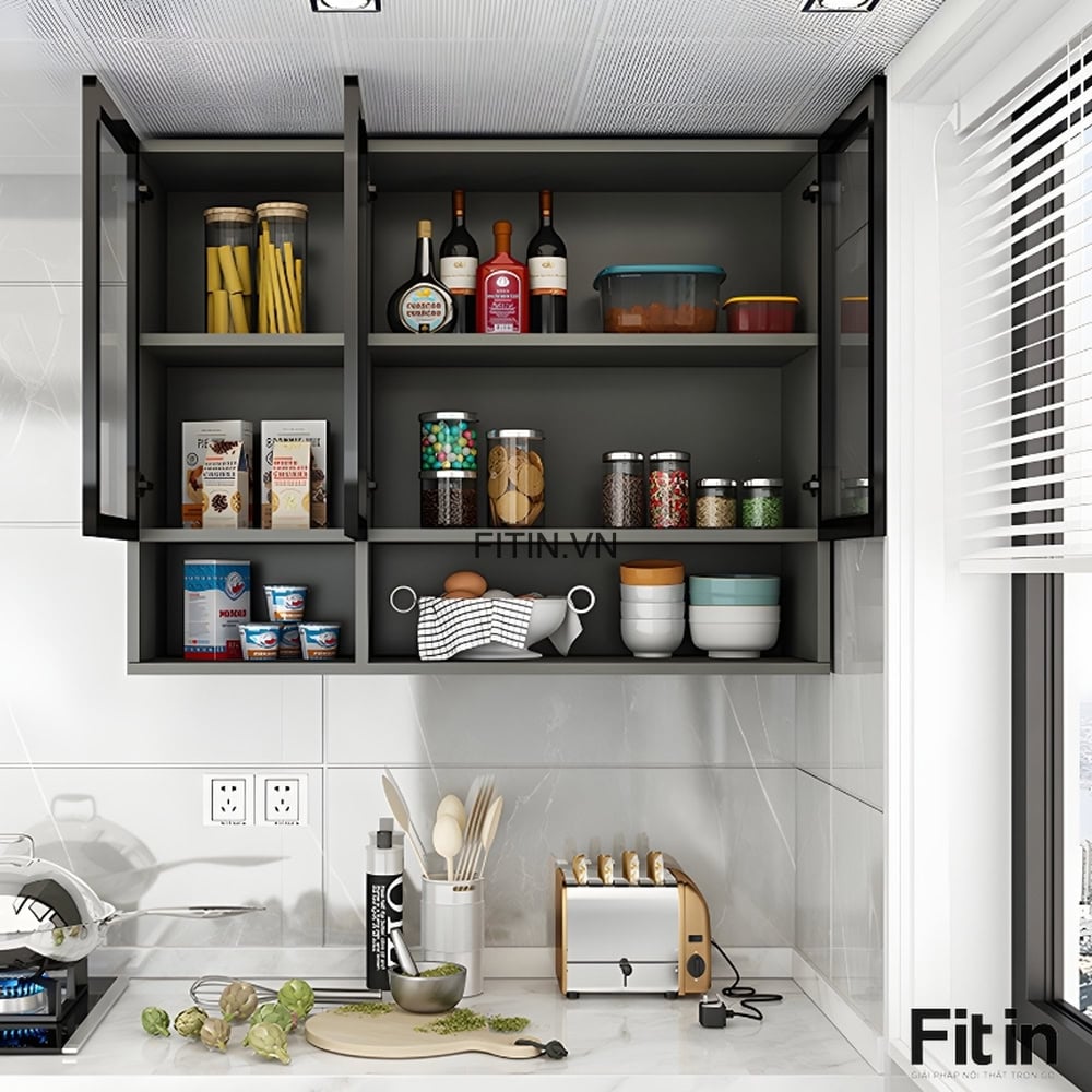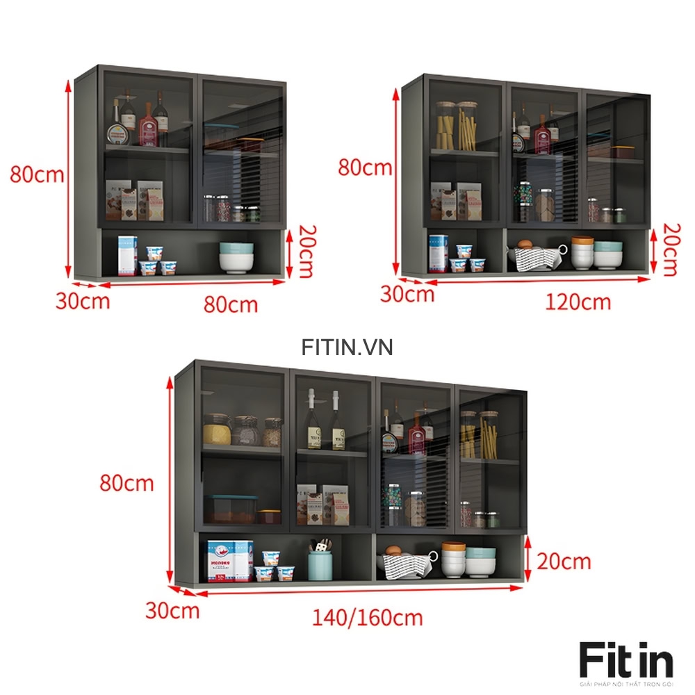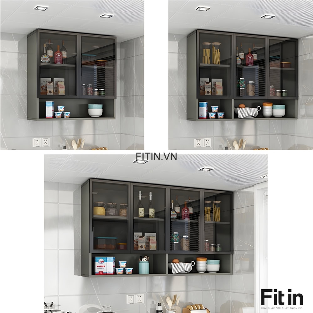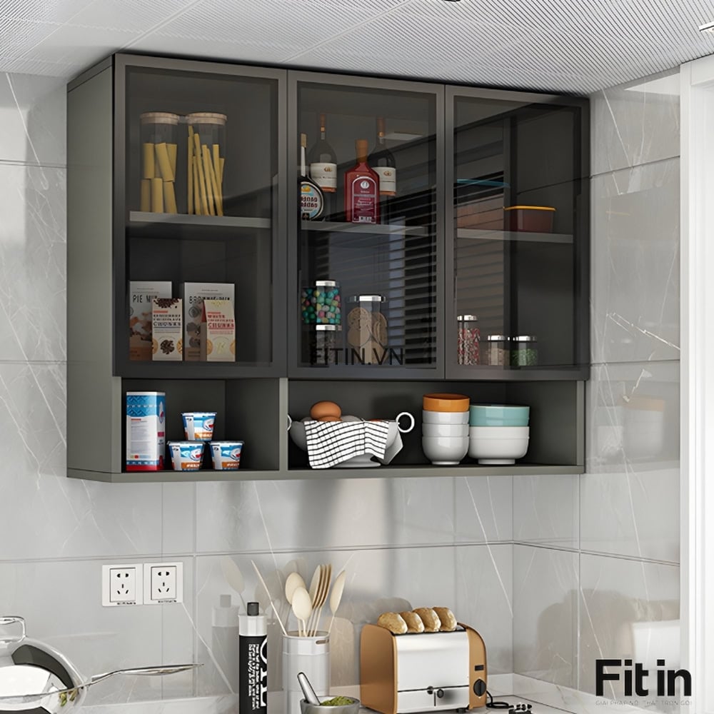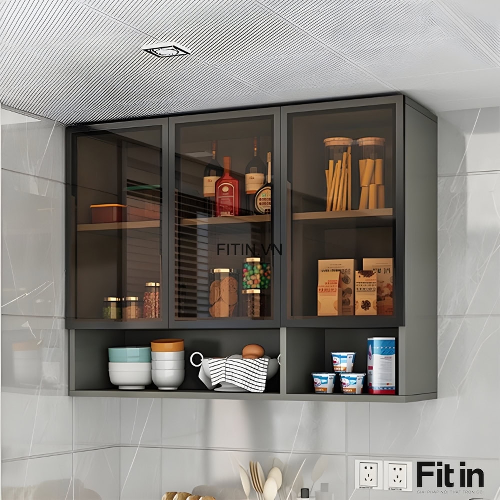 Tủ Chén Treo Tường Gỗ MDF Cánh Kính Cường Lực Khung Nhôm