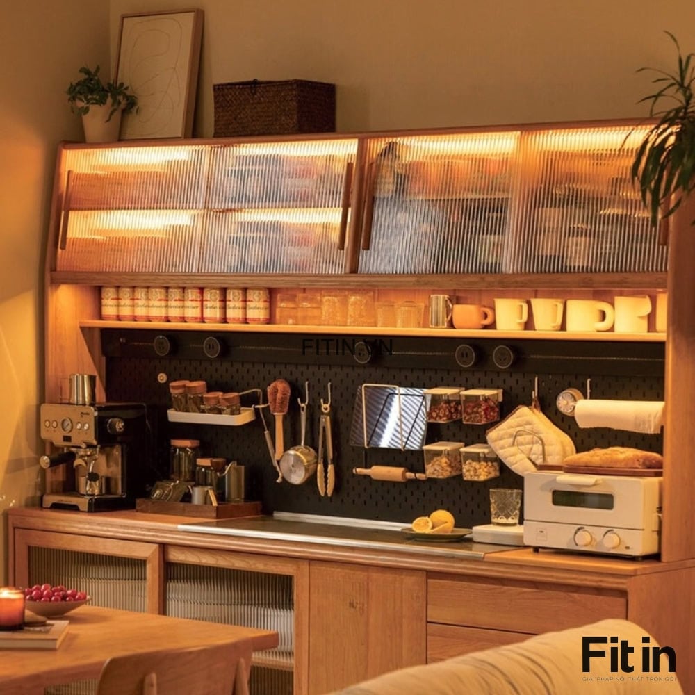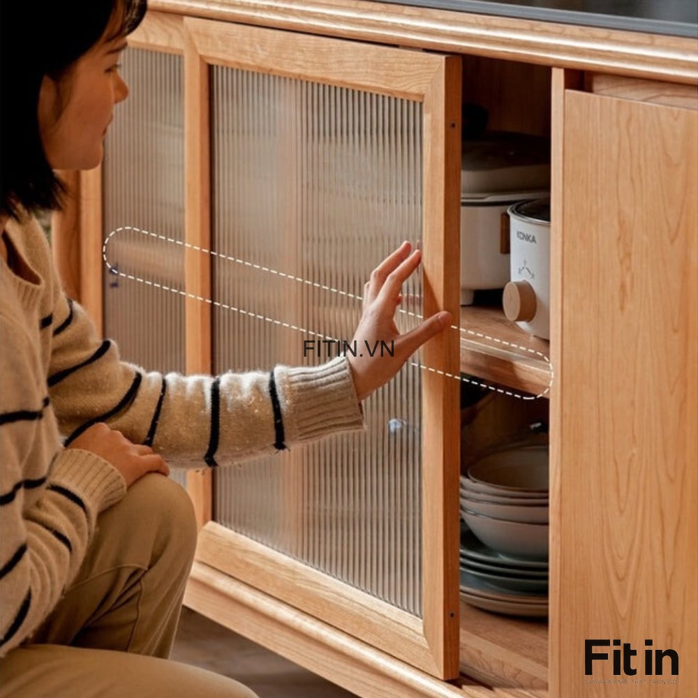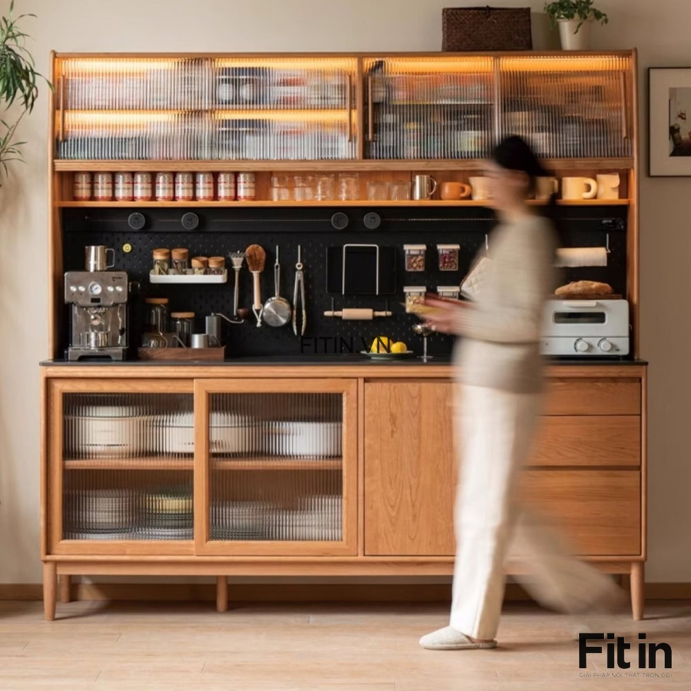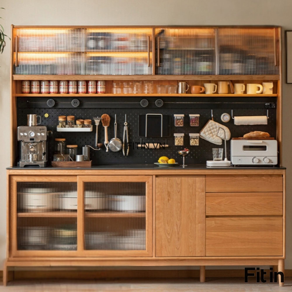 Tủ Đựng Bát Đĩa Xoong Nồi Gỗ Sồi Cánh Kính Sọc Kích Thước Lớn