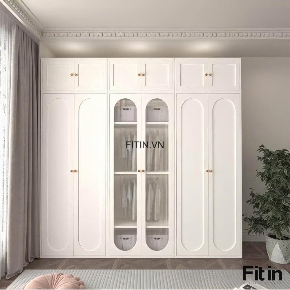Chất liệu: Gỗ MDF phủ Melamine, cánh sơn trắng + kính sọc