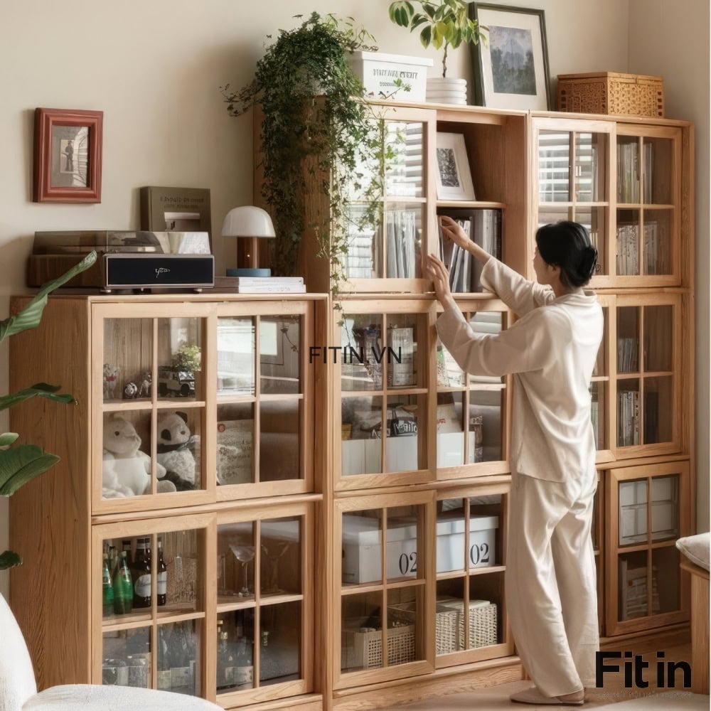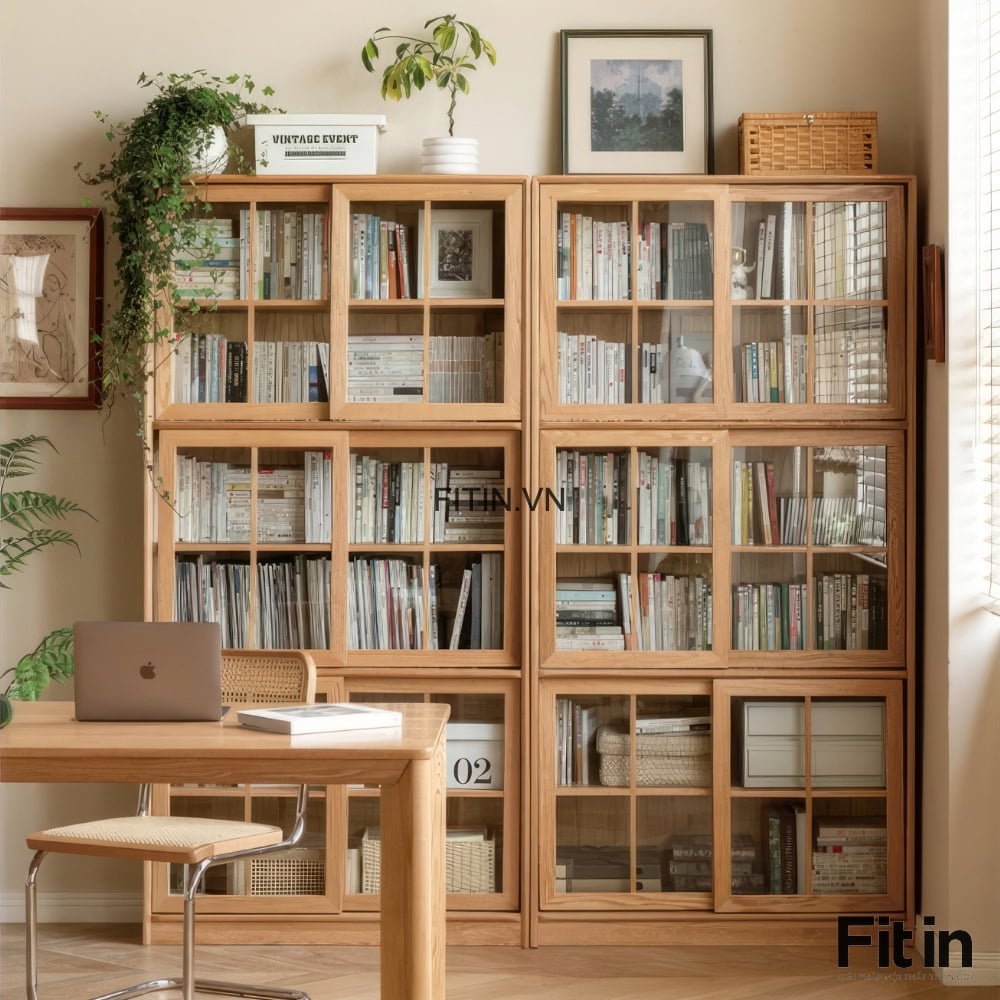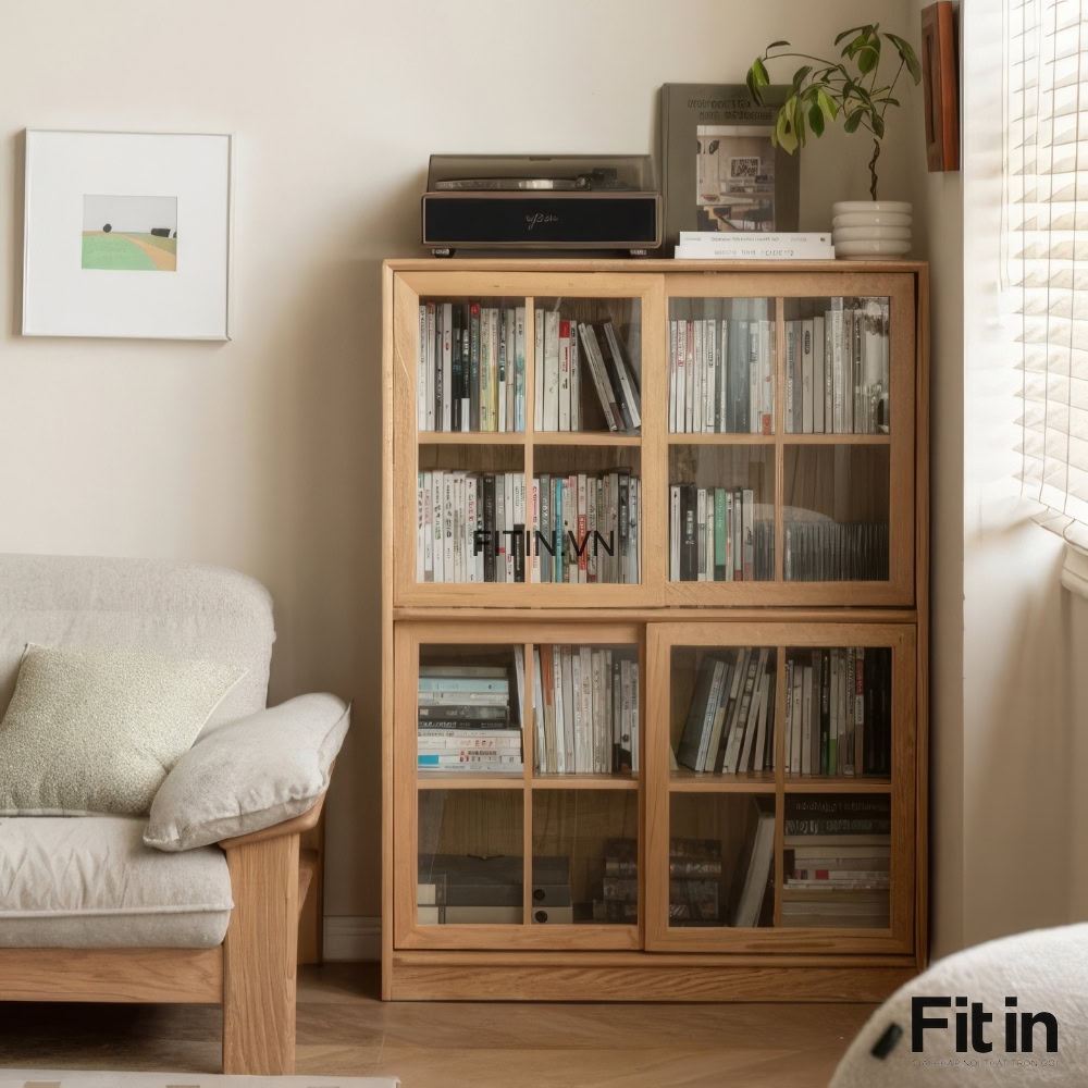 Tủ Sách Có Cửa Kính Kiểu Lùa Gỗ Sồi Đa Năng Hiện Đại