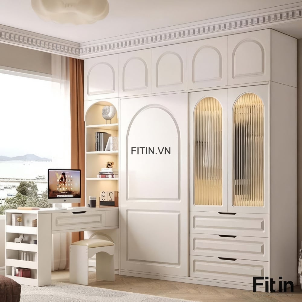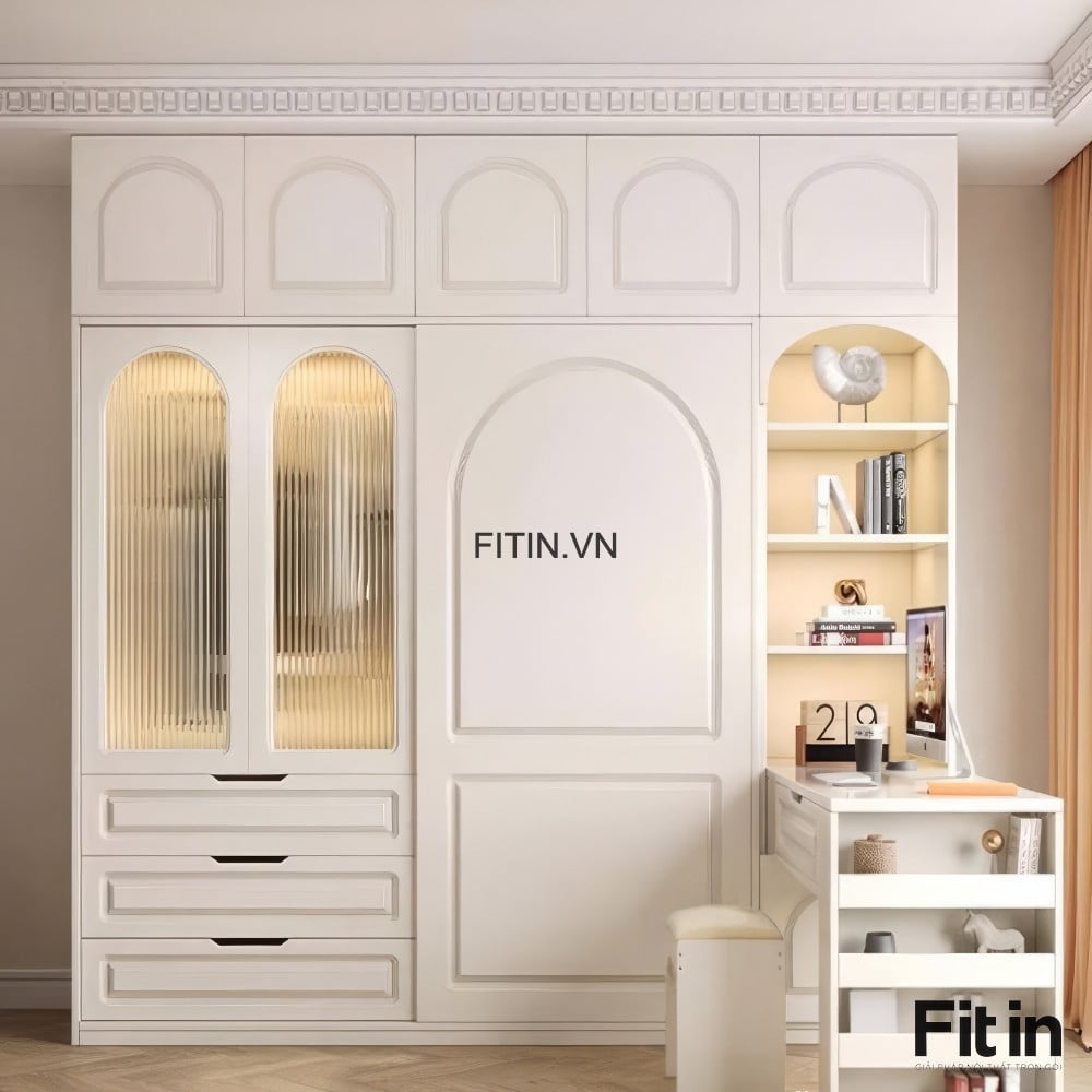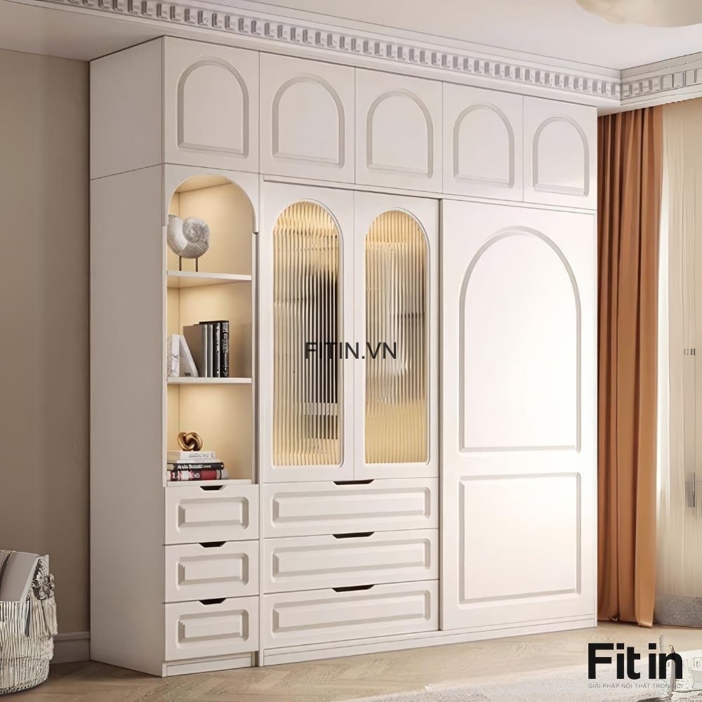 Chất liệu: Gỗ MDF phủ Melamine, cánh sơn trắng + kính sọc